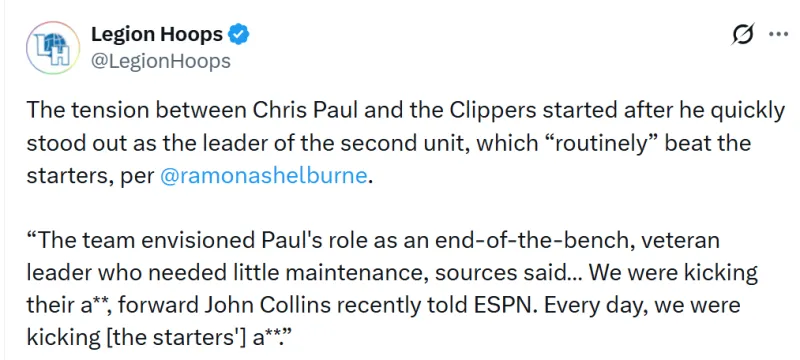 虎扑12月17日讯 今日,美媒LegionHoops发文,称保罗迅速成为第二阵容的领袖并且经常带领替补击败首发,这使快船与保罗关系紧张。