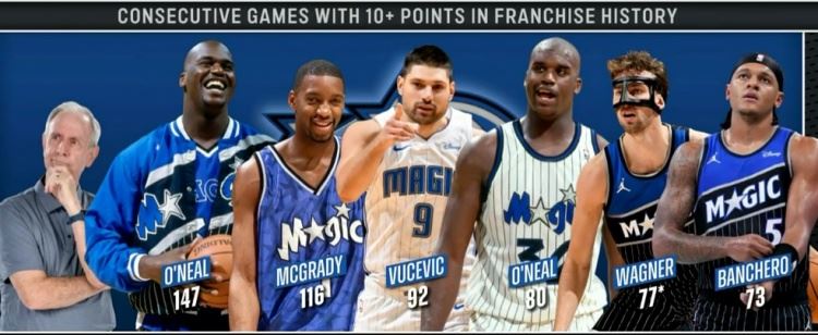 魔术队史连续10+场数榜:奥尼尔147场第1麦迪第2 班凯罗&小瓦在列